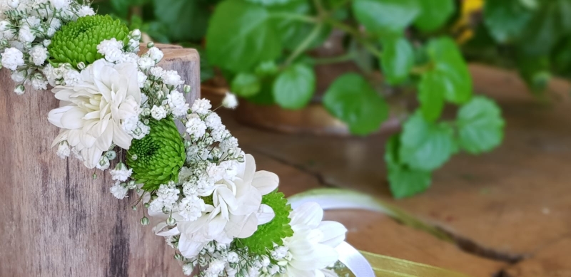 זר ראש שזור חרציות לבנות ירוקות וגיפסנית