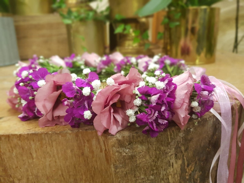 זר ראש שזור ליזיאנטוס ורוד וגיפסי פוקסיה
